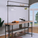 PARIAMAN Bar Table, Sand Black/Natural, 62 1/4"L X 23 5/8"W X 77"H, TABLE SIZE: 59"L X 23 5/8"W X 36 1/4", 134.2lbs. Fully constructed in metal, this unique bar table is best suited for spaces that embrace the industrial trend. All the elements are here to make this the perfect piece--replicated piping accents, hand-painted copper details, and a metal mesh divider underneath. Even the overhang glassware rack and shelf is made of metal. The open surfaces made of paper veneer, however, are finished in a lighter natural tone. It creates this beautiful dichotomy between the sand black finish of the metal frames and the replicated wood, giving it much needed warmth.